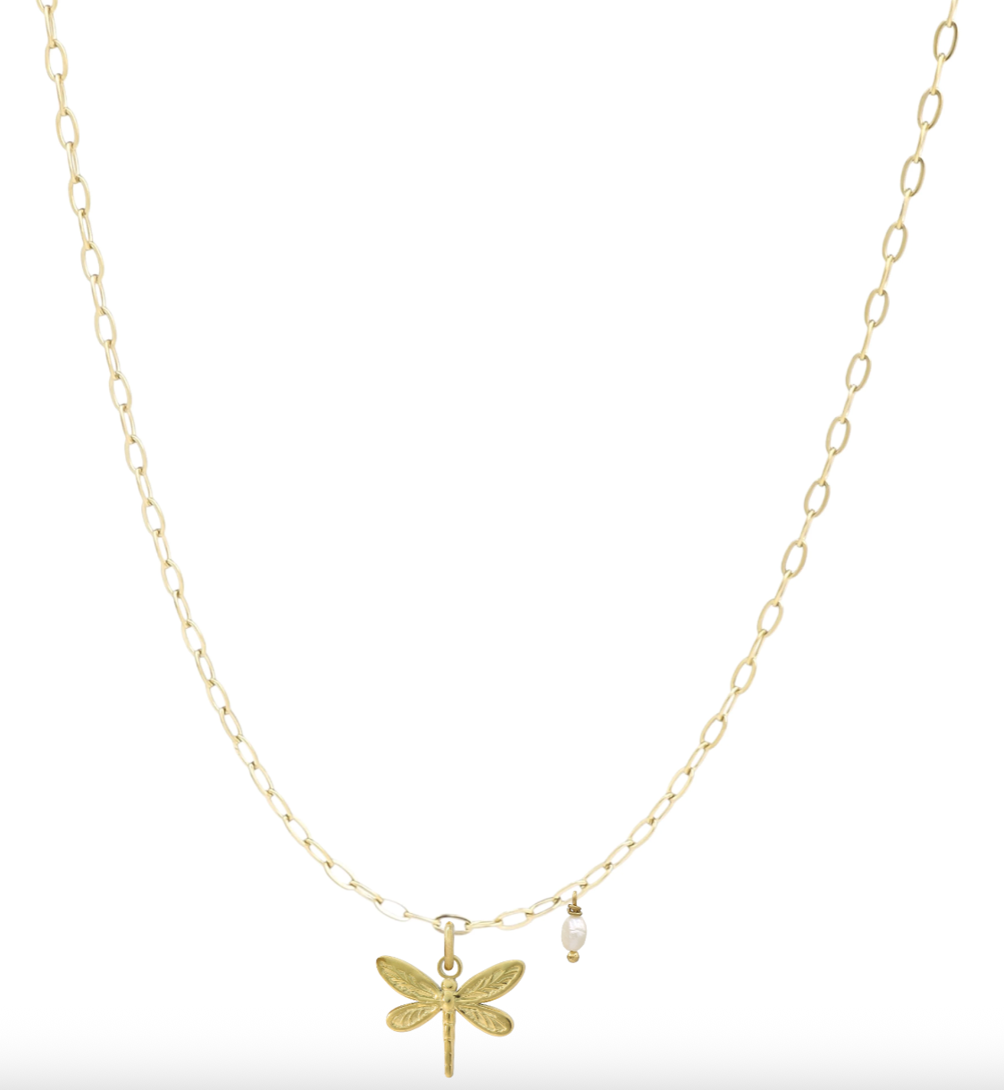 Delicate necklace with a dragonfly charm and a genuine freshwater pearl pendant – inspired by summer and the lightness of the moment.