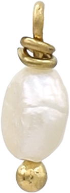 Der Anhänger ist selbstgemacht mit einem goldenem Niedstab aus wasserfesten Edelstahl und einer Süßwasserperle. Die Süßwasserperle verleihen dem Anhänger eine leichten, schimmernden Look, welcher sich perfekt mit anderen Edelstahl- und Perlenanhängern kombinieren lässt.